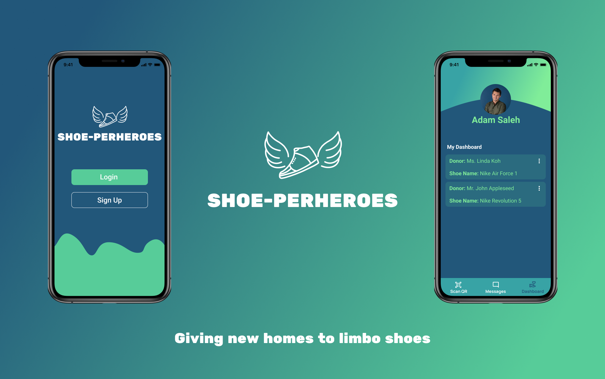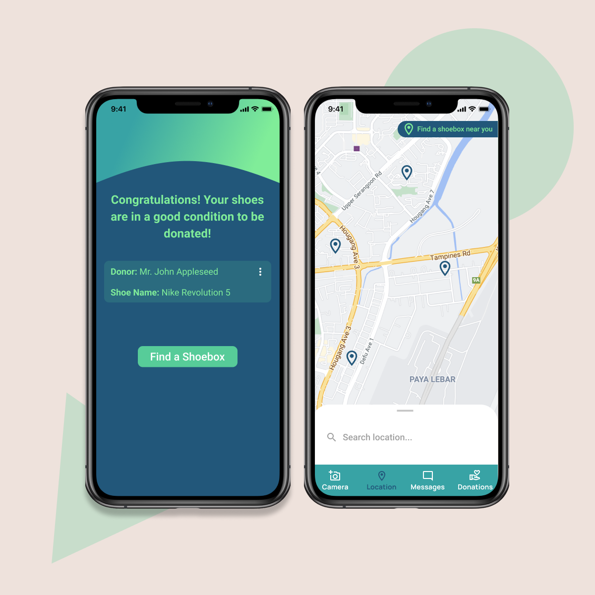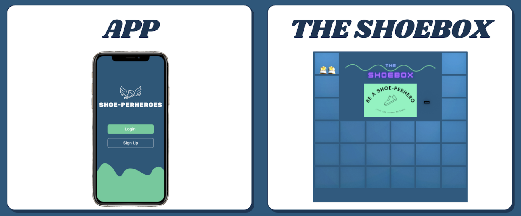 The Shoe-perheroes ecosystem comprises the app and Shoebox, the collection kiosk. The app uses computer vision to validate that donors' shoes are still usable, and directs them to the nearest drop-off point, the Shoebox kiosks. Shoebox kiosks collect donors' shoes and tag each pair to donors' accounts.